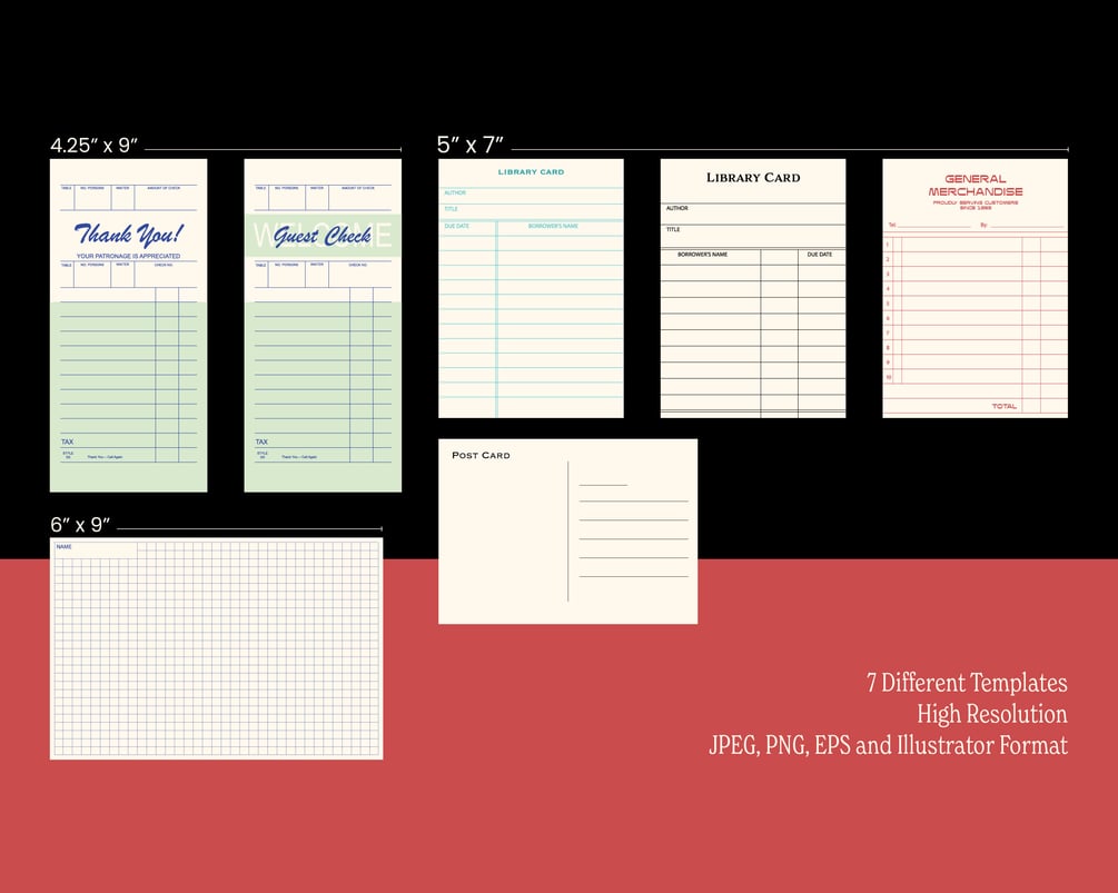 Vintage Cards & Receipts is a set of throwback styled cards and receipts. These are items you may no longer see in the wild but are provided here in digital format for you to design with and have fun. The set includes neatly organized files in high resolution with the ability to be customized. You can also use them as drag and drop items for existing art you might already have.