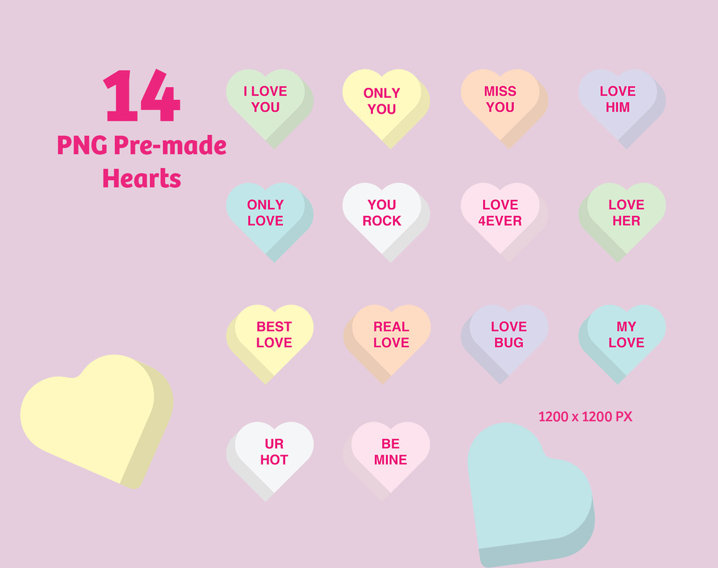 - 14 Candy Hearts with a Message in PNG format only (1200 x 1200 px)
