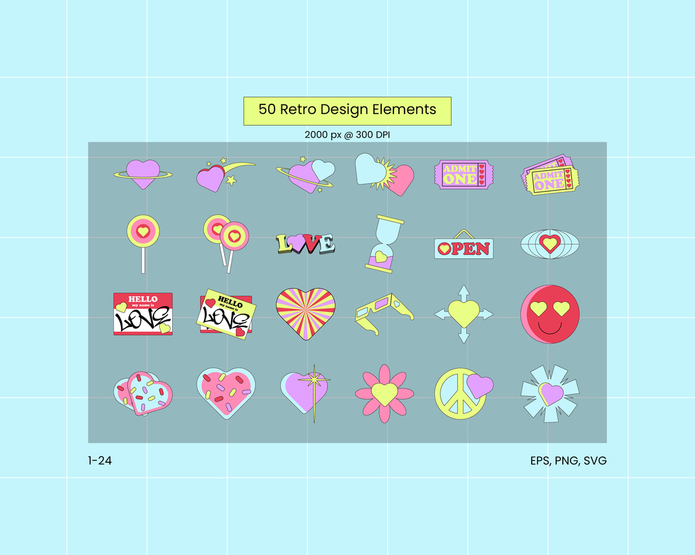 Spice up your projects with vibrant 90s-inspired heart designs! This pack includes custom-made retro-modern illustrations perfect for social media, flyers, presentations, and more. Add a playful and colorful touch of nostalgia to your work.