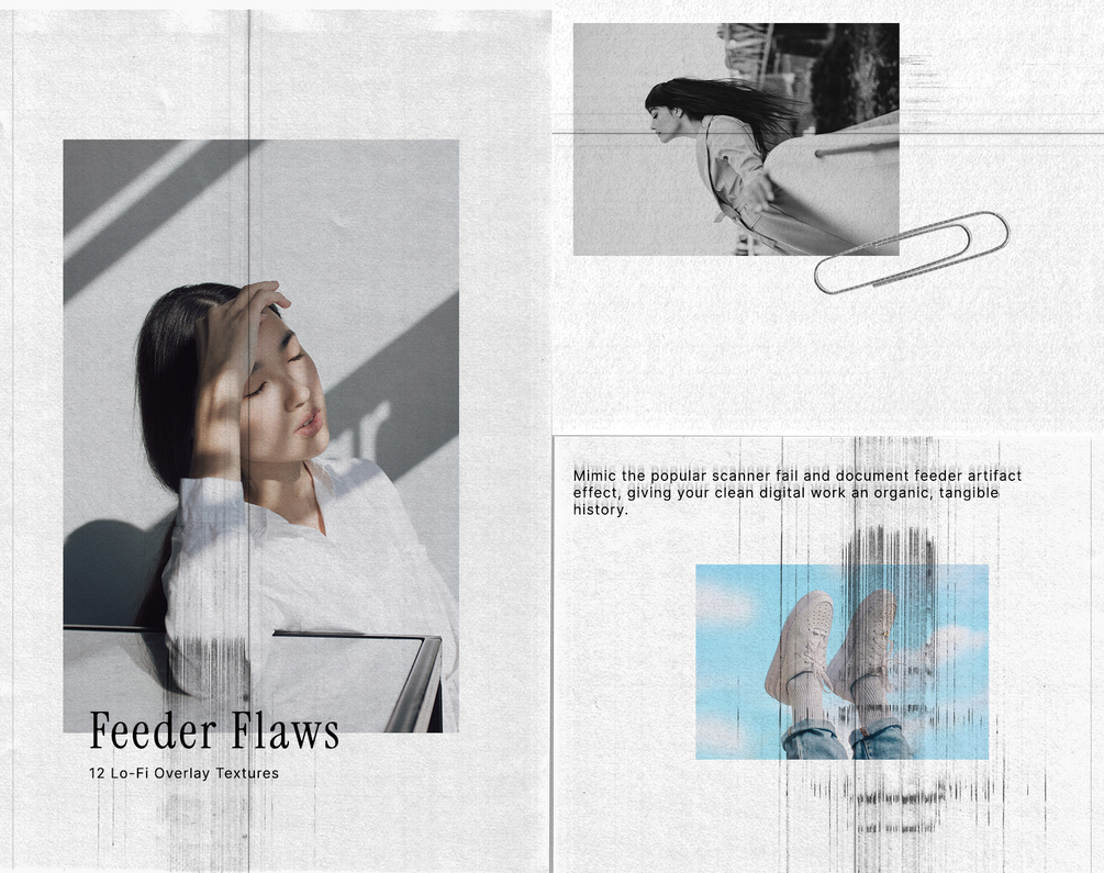 The Feeder Flaws Texture Pack is the fastest way to achieve the current, highly sought-after digital grunge and "lo-fi" aesthetic. Tired of generic noise? This pack delivers 12 genuinely flawed, high-resolution textures created from real document feeder malfunctions and printer grime.