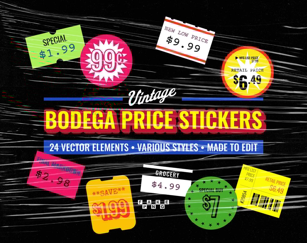 24 vintage inspired bodega price stickers in PNG and Illustrator formats